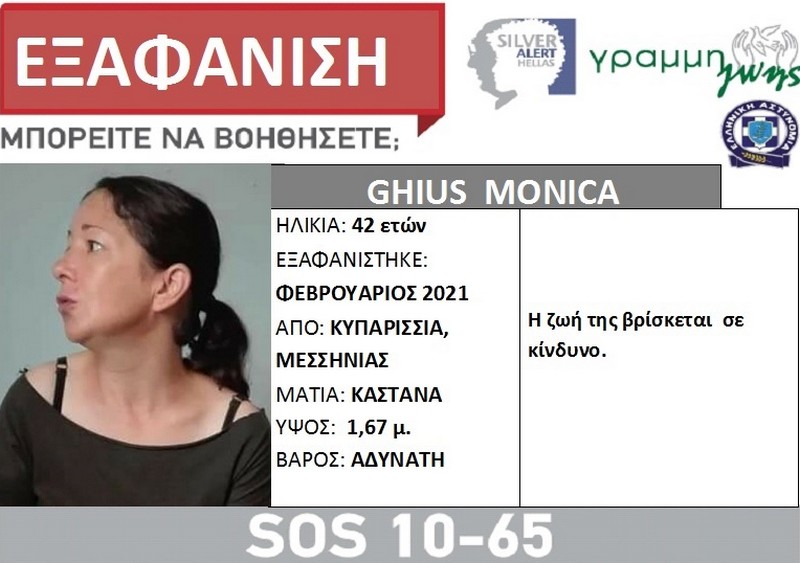 Η Ghius Monica, 42 ετών, εξαφανίστηκε το Φεβρουάριο του 2021 από το σπίτι της, στην Κυπαρισσία, Μεσσηνίας. Έχει καστανά μάτια, ύψος 1,67μ και είναι αδύνατη.